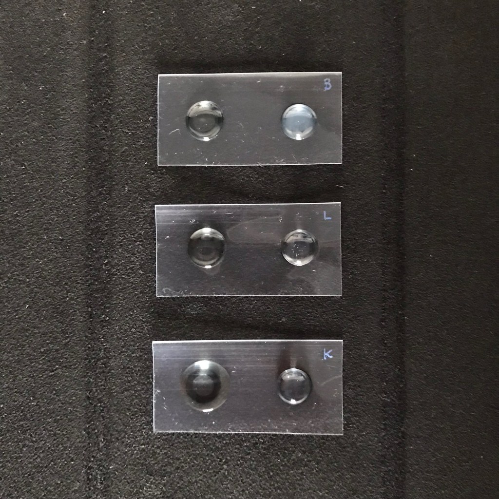 ジェルを一滴、直径7ミリの円が書いてあるプラスチックのプレートにのせて、LEDライトで35秒硬化させました。(使用したライトはSHINYGEL CRESCENDO HYBRID 36W)
