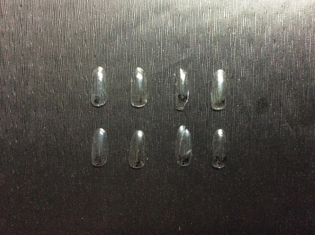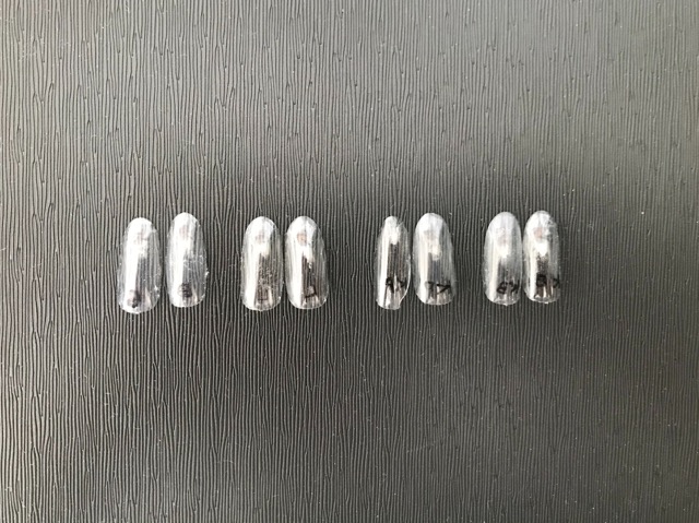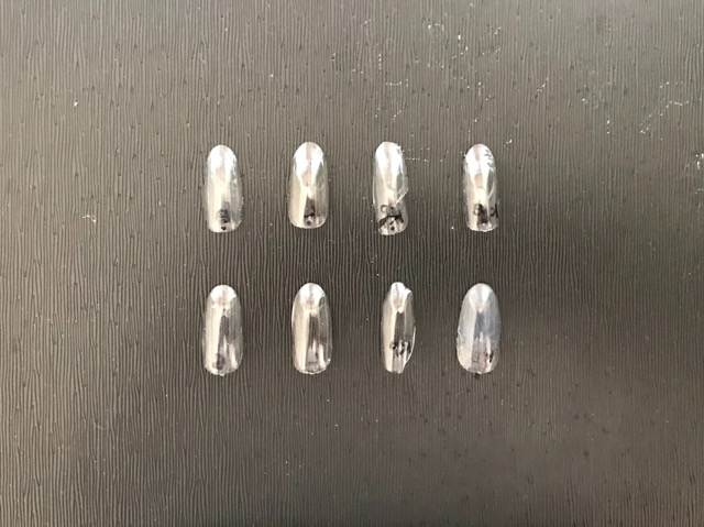 今回は、実際の爪に背術された様な試験体にしました。ネイルチップにディフェンダーを塗り、ベース、ビルダージェル、トップジェルをそれぞれ塗って硬化させ、そして水に浸してジェルだけを剥がしました。バイオスカルプチュアジェル、ララジェル、ココイストプラチナボンド2使用、ココイストビルダージェル使用、以上4種類の試験体を用意しました。