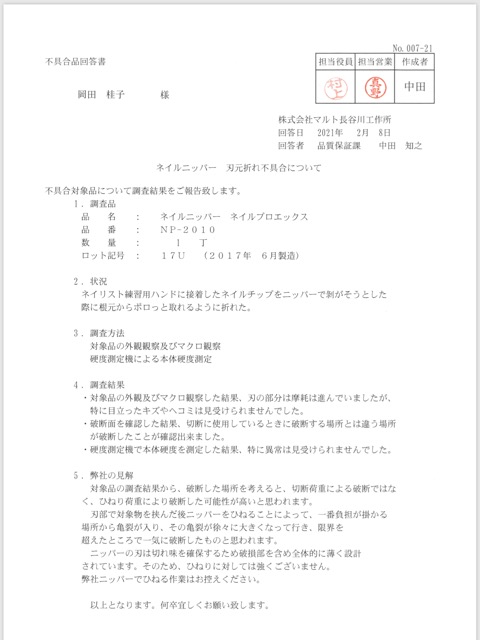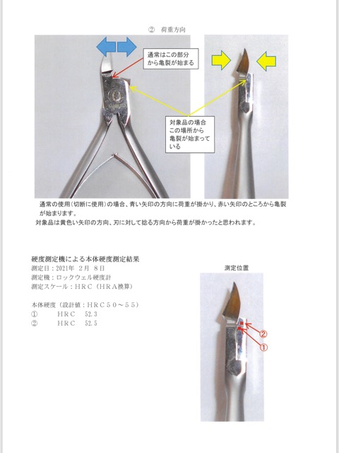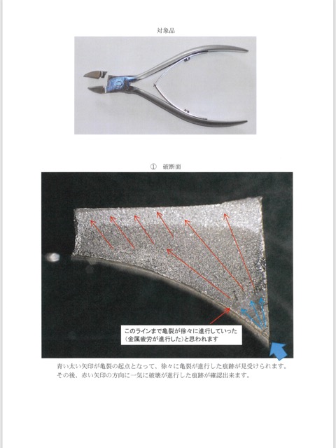 メーカーでは折れた部分近くの硬度調査と、折れた面の精密検査をして下さり、