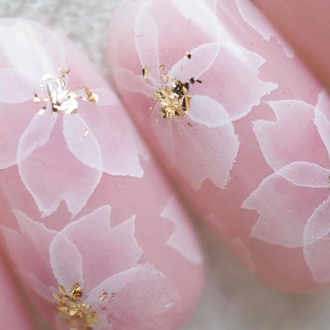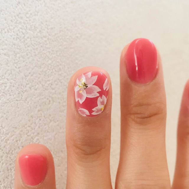 そこに、持ち込んだ画像の桜アートを一本お願いしました🌸このくらい出来るようでいたいと思ったのです☺️やり方は2通りあって、絵の具か、ジェル。画像は絵の具のようですが、先生はジェルでやってくれました。白で花の輪郭を描いて、そこに白グラデーションを平筆でとって花びらにのせていく。最後に金箔をのせて、トップを全てにかけました。