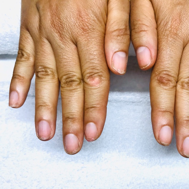 ジェルは初めてということで、剥がれかけていたラッカーを落とすと、爪が乾燥して焼けてしまったかのように、先端あたりが二枚爪で変色していました。でも、しっかりした良い爪の方だったので、それらをファイルで削り去り、表面をなだらかにして整え、ジェルを塗って仕上げました✨
