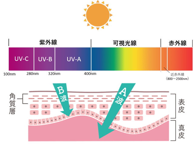 UVAは真皮に達してコラーゲンやエラスチンにダメージを与え、皮膚の老化に影響します。